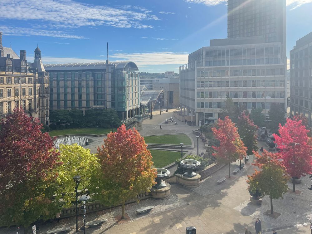The view of the Peace Gardens from the wonderful restaurant terrace of the new Radisson Blu hotel opposite.