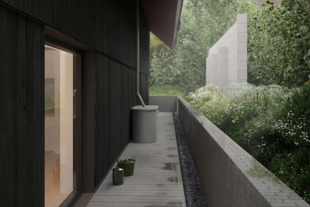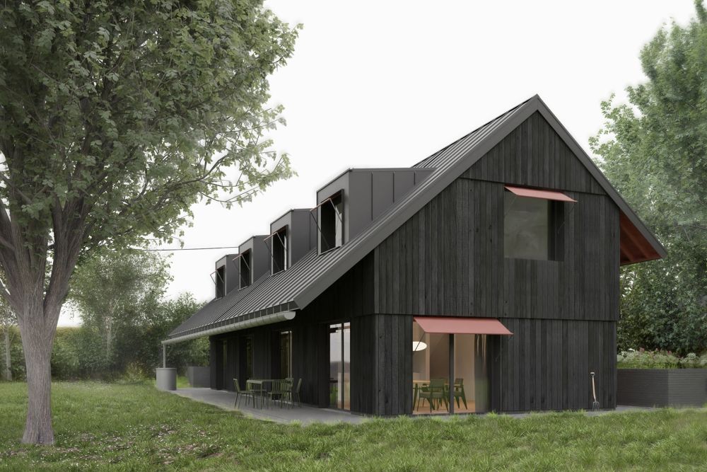 The domestic roof form conceals an upper storey with dormer windows. Blackened timber cladding covers thick, highly insulated walls.