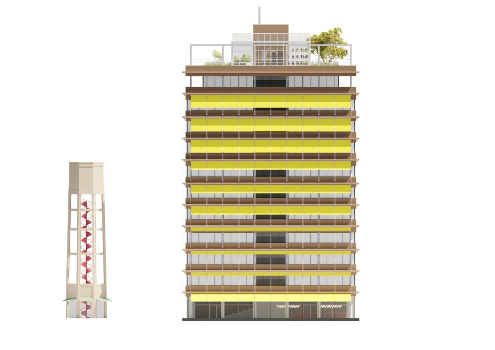 The primary entrance is located centrally, allowing secure through-access between Granary Street and the proposed hospital building to the west. Studio Multi and engineer Whitby Wood have proposed the retention and short relocation of a landmark water tower to a new square at the centre of the masterplan.