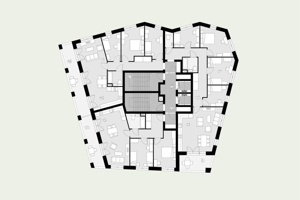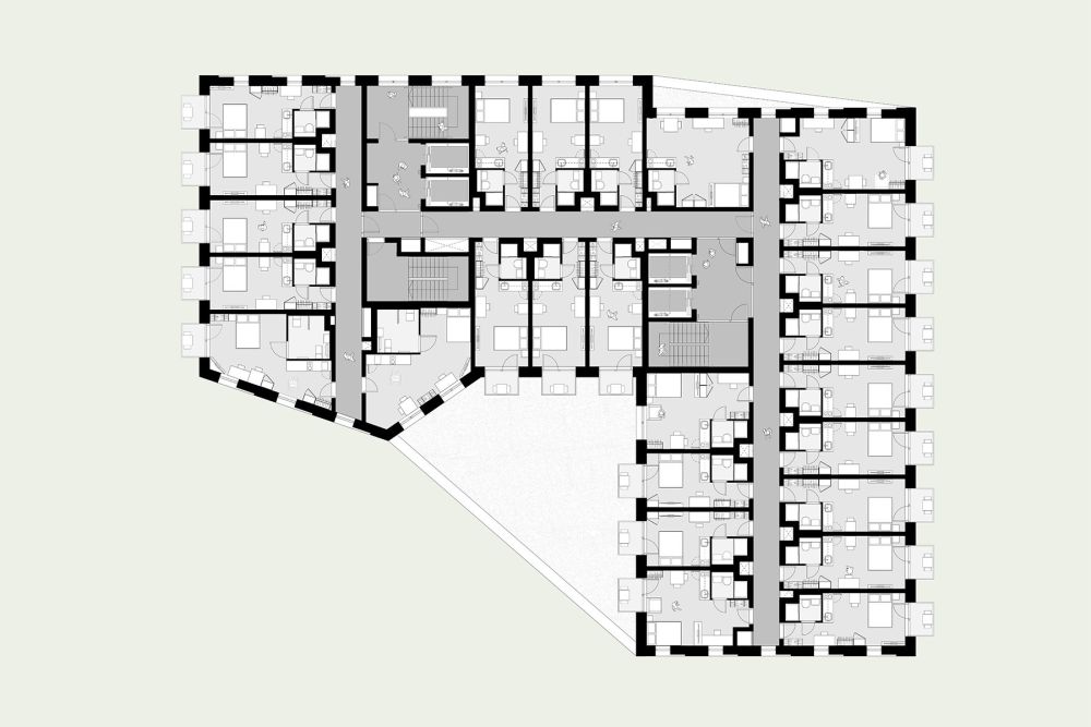 The main building provides 216 generously sized shared living studios, with a plethora of shared amenity spaces arranged strategically around the building. Existing workspace on the site is replaced with two floors of flexible Class E space suited to managed workspace and coworking.