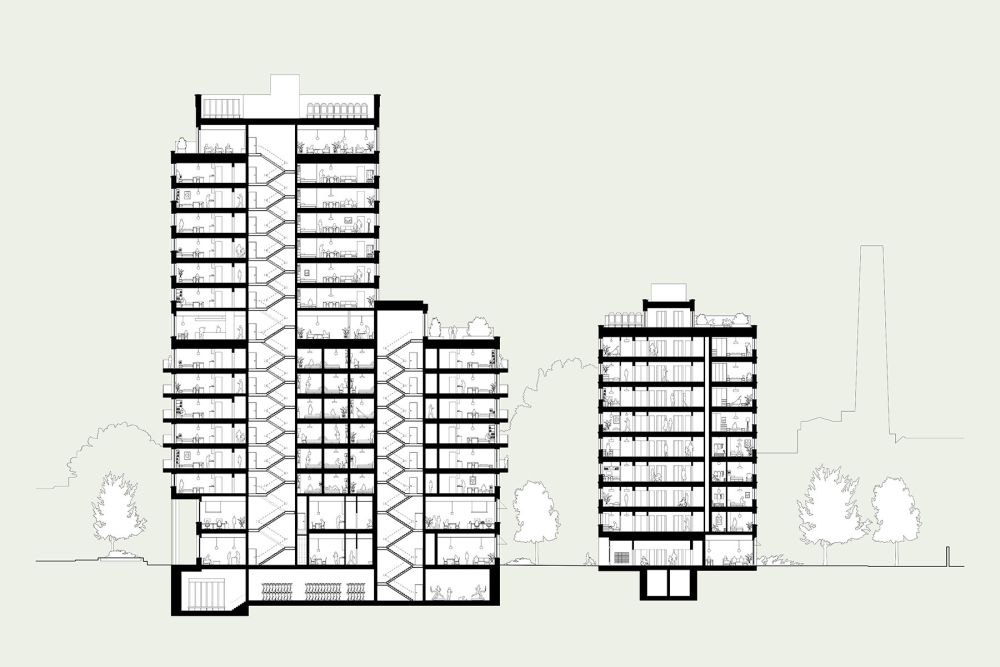 The main building is 16-storeys in height, which has been sculpted to accommodate a protected view from Greenwich Park toward Tower Bridge and St Paul’s Cathedral. This has resulted in the creation of a generous roof terrace connected to one of the key amenity levels, with fantastic views toward the River Thames and landmarks of London.