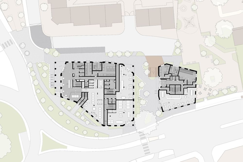 The smaller building provides 24 on-site affordable homes for families, along with a community cafe at ground level as part of the mixed-use commercial offer.