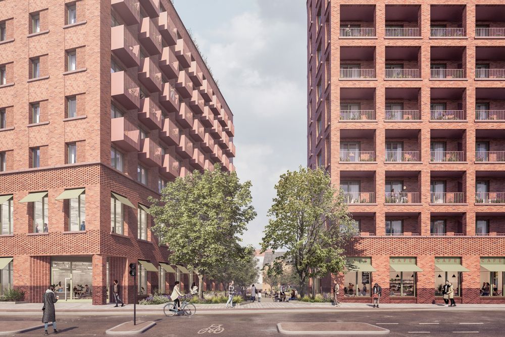 The project comprises two buildings that form a new street between them linking Southwark Park from the west to historic Rotherhithe toward the east.